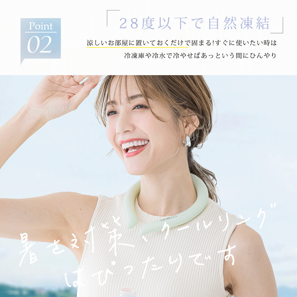 ・暑い真夏の季節でもリングはひんやりキープ!28度以下の空間で凍る不思議な氷「PCM素材」で作られた首元用のネッククーラー。