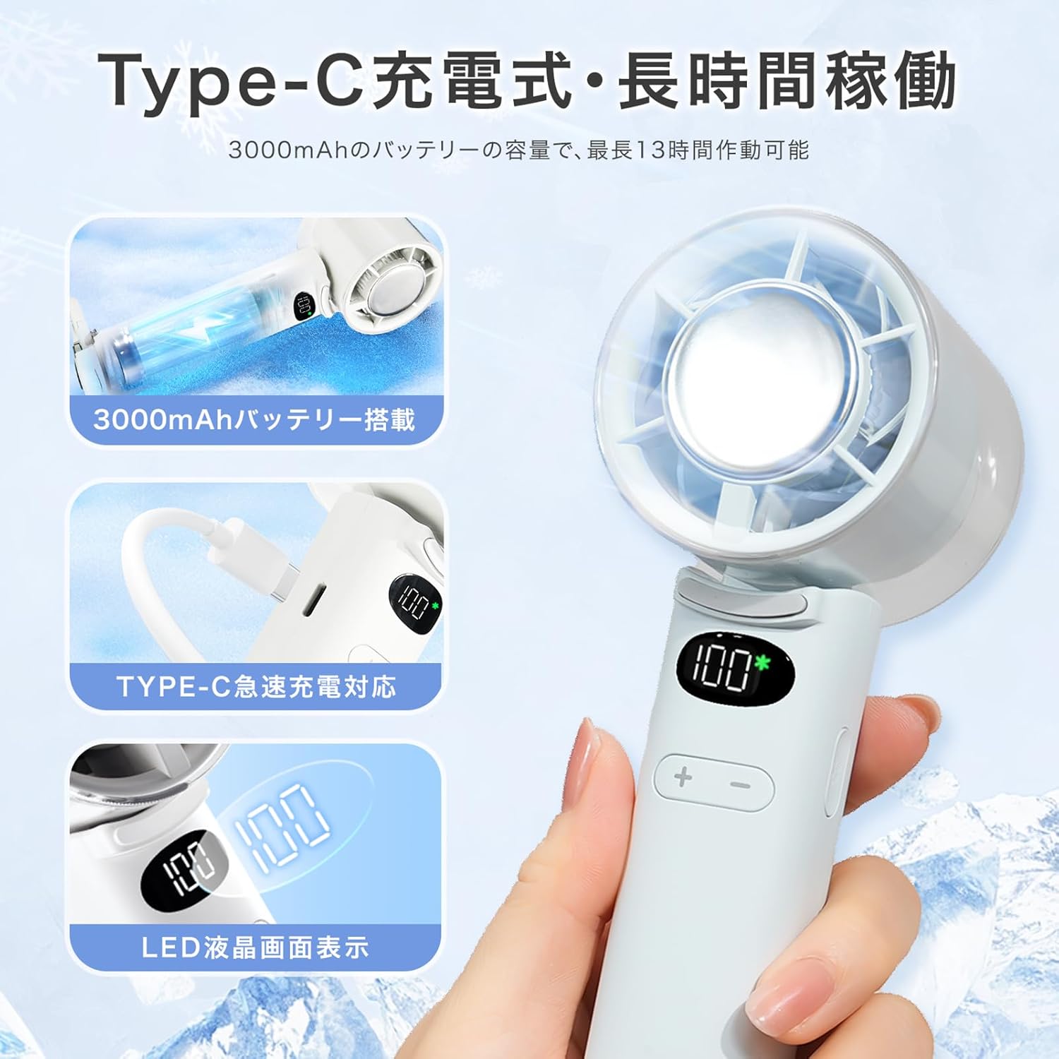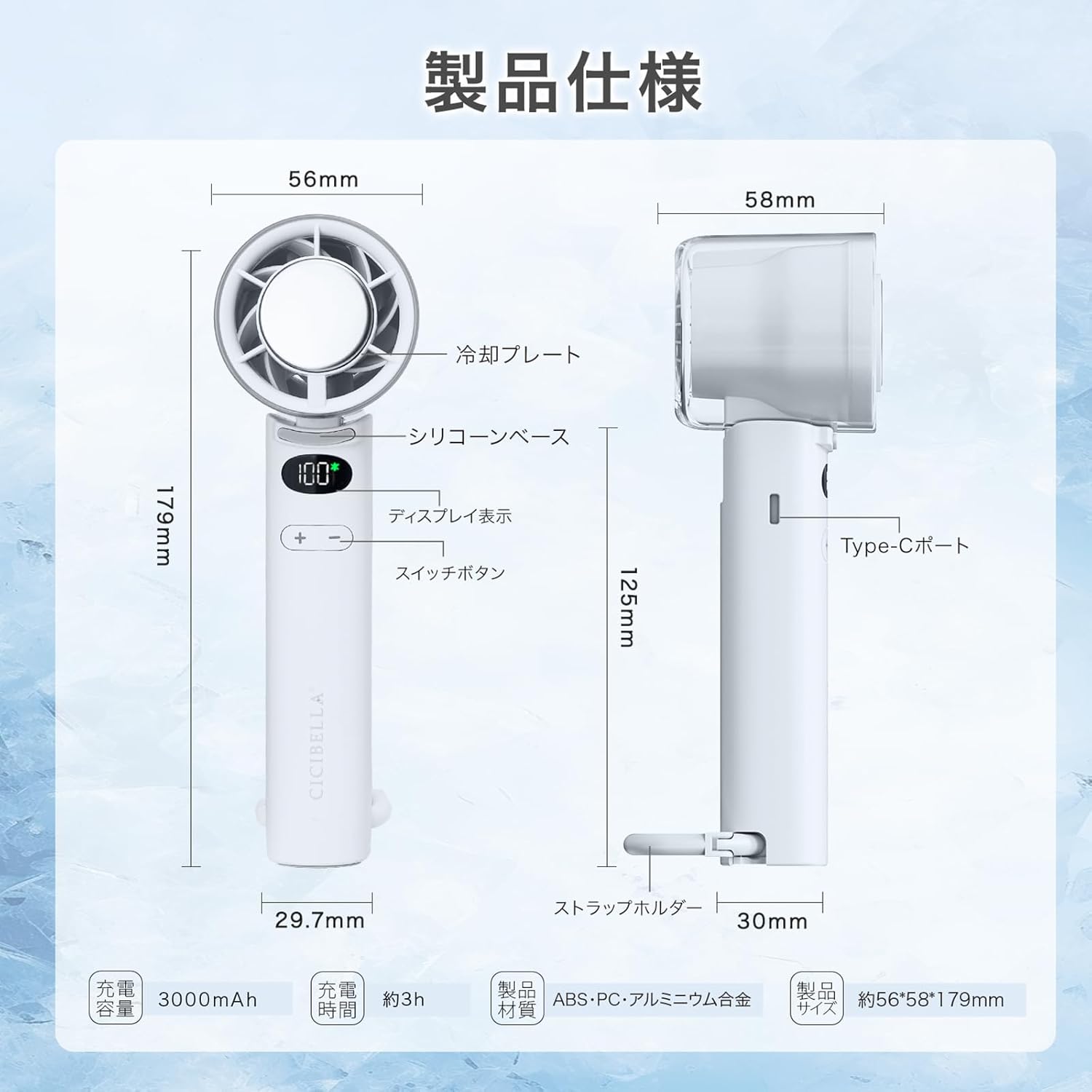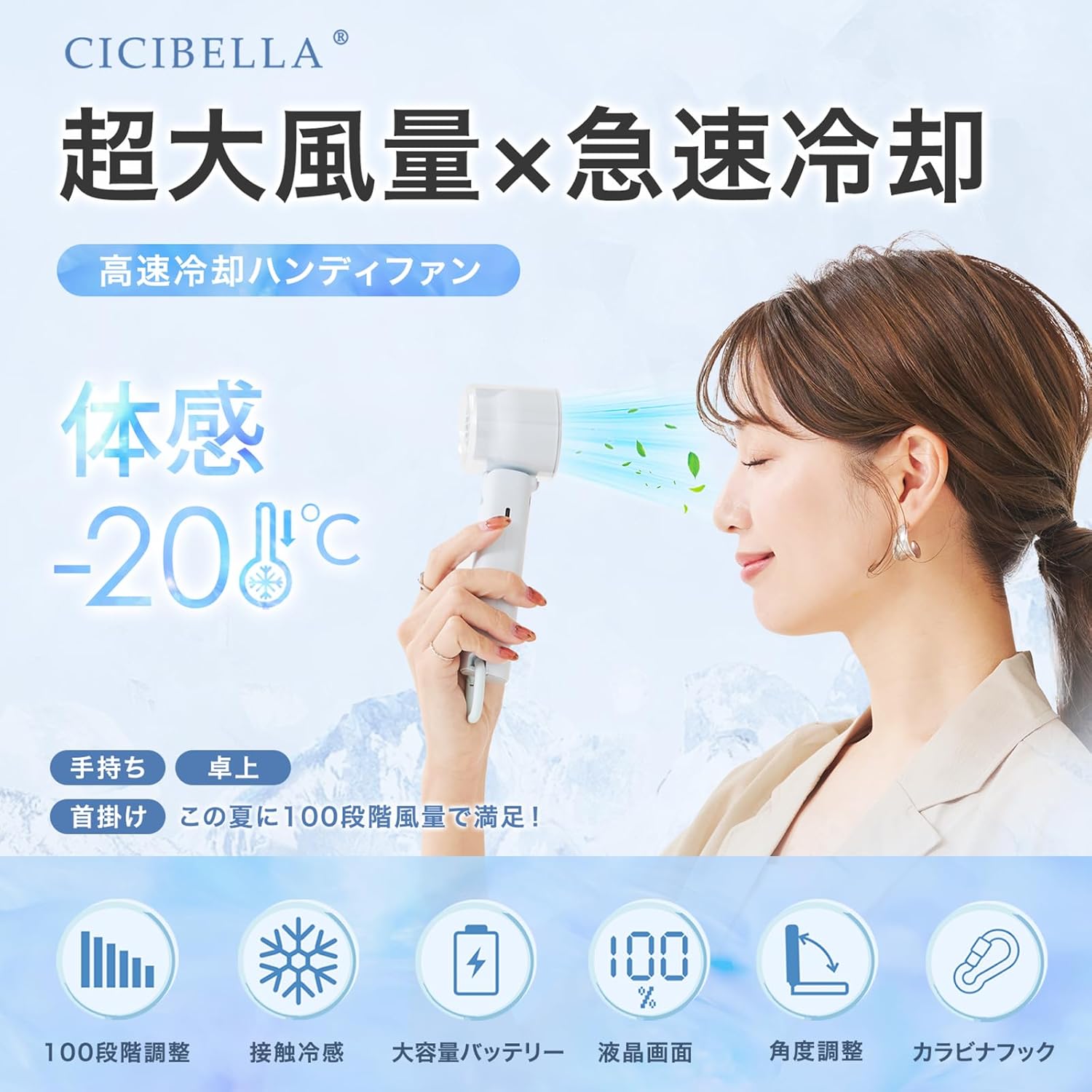 \2025夏新登場/CICIBELLA ディスプレイ付きコンパクト冷却ハンディファン 冷却機能+100段階風量調整で、最強の涼しさを実現! コンパクトなのにパワフル!ディスプレイ付きでバッテリー残量が一目でわかる 最新モデル登場! 3000mAhの大容量バッテリー搭載 で、最長12.5時間 連続使用可能! さらに、冷却プレート機能 でひんやり爽快な風をお届け POINT 冷却プレート搭載:扇風機+冷却で圧倒的な涼しさ! ディスプレイ付き:バッテリー残量が一目で確認できて便利! 100段階風量調整:シーンに合わせて細かく風量を設定可能! USB Type-C充電対応:約3.5時間の充電で長時間使用OK! コンパクト&軽量設計(約205g):持ち運びもラクラク! 通勤・通学・オフィス・アウトドアに最適! この夏、CICIBELLA ディスプレイ付きコンパクト冷却ハンディファン で、究極の涼しさを体験しよう!
